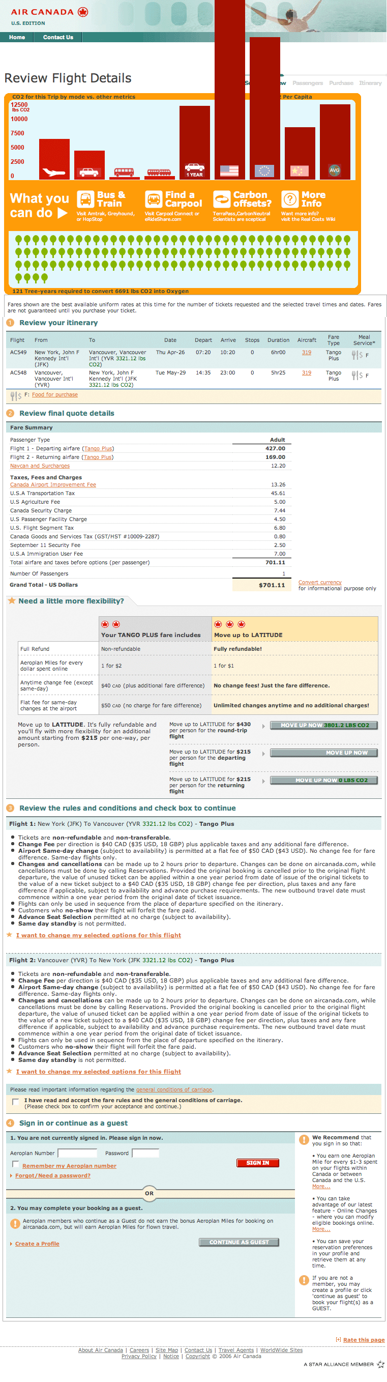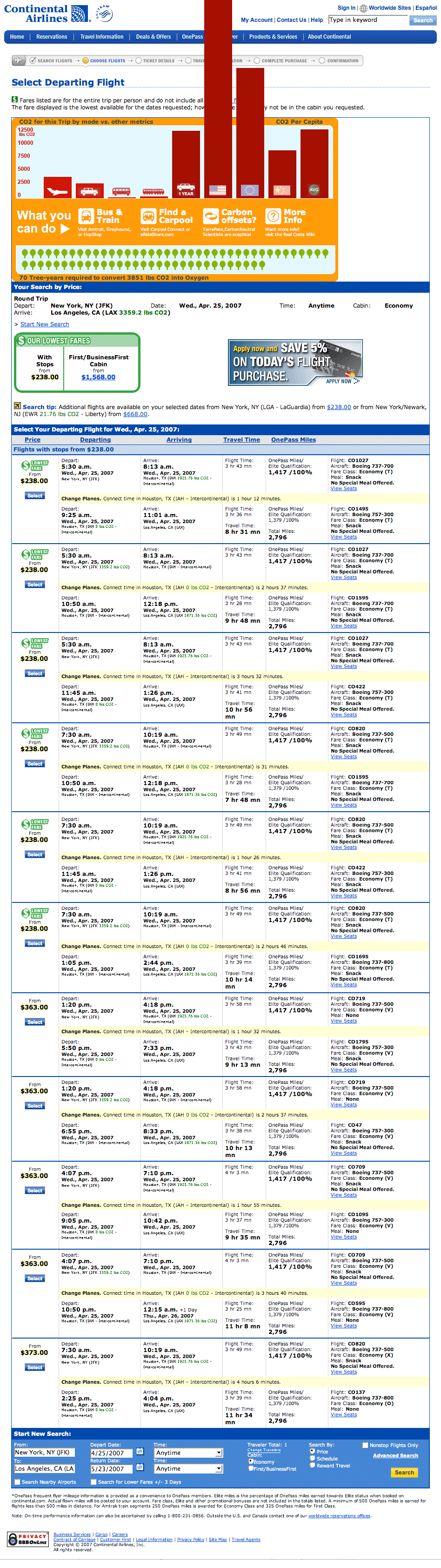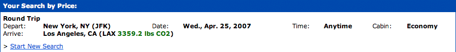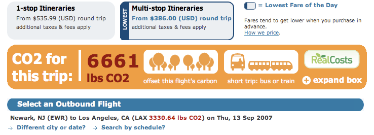 Experience the project by installing the Real Costs plug-in into your Firefox application. Currently, this plug-in pulls each flight origination and destination information from the page, calculates and reinserts the CO2 produced. It compares the CO2 produced for that flight to making that trip by bus or train, and to the average CO2 produced per capita for the average US and world citizen. It is configured to work on the websites of the largest North American air carriers (major global air carriers to be added shortly.) A list of these carriers and documentation of all scientific calculations is available on the project Wiki.